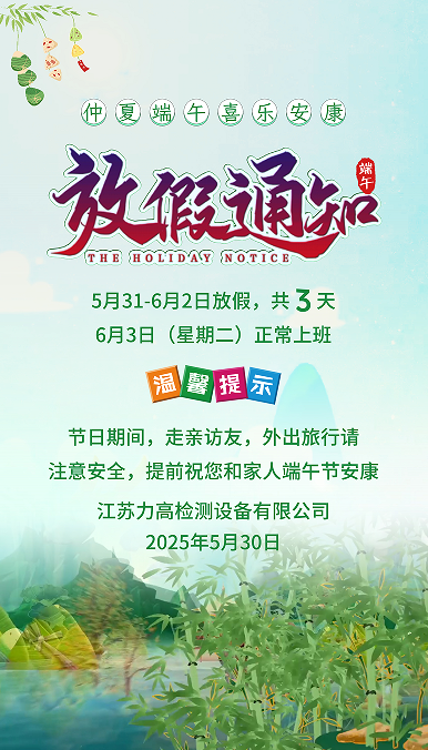 根據(jù)國務(wù)院辦公廳《關(guān)于2025年部分節(jié)假日安排的通知》精神,2025年端午節(jié)假期定為5月31日(周六)至6月2日(周一),共3天。本次放假無需調(diào)休,為企業(yè)員工與客戶提供了連貫的休息時間。值此傳統(tǒng)佳節(jié)之際,江蘇力高謹向全體員工及合作伙伴致以節(jié)日問候,并同步安排假期相關(guān)事項,確保業(yè)務(wù)銜接與客戶服務(wù)不受影響。
